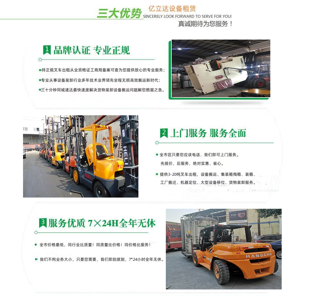 亿立达设备租赁有限公司是工商局准许的深圳上沙专业叉车出租公司,公司本着诚信、服务、效率、创新的经营理念,用精湛的技术,真诚的服务,为众多客户提供优质的服务,同时获得信赖与支持。专业提供深圳上沙3-20吨叉车出租、叉车租赁、设备搬运、集装箱掏箱装箱、机器移位定位、货物装卸、工厂搬迁、安全可靠,收费透明,价格便宜,随叫随到,24小时上门服务!本公司叉车吊车师傅对各种设备搬运装卸都有深刻探讨和研究。很多的疑难设备搬运,通过我公司的叉车师傅都能迎刃而解。对各种进口设备、国产机器、大型设备搬迁、高难度搬迁、各种精密仪器、医疗设备、科研设备等都能搬运; 提供全市 24 小时上门装卸搬运服务。同时提供厂房搬迁服务。 ...